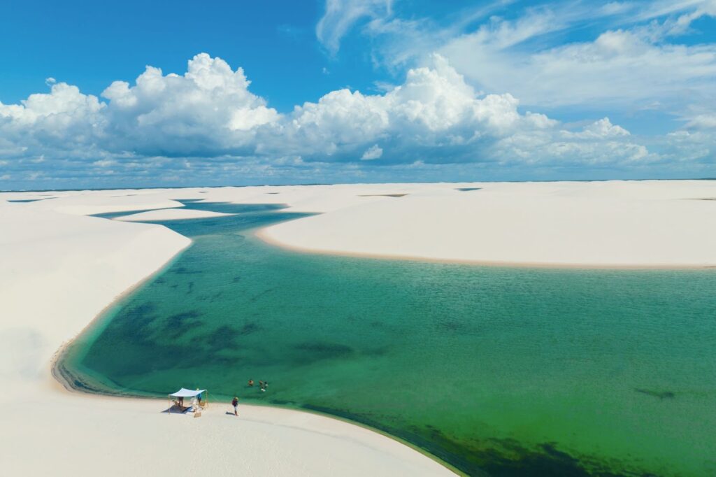 Lençóis Maranhenses, Brasil – Deserto de dunas brancas e lagoas de água doce. Sobrevoo de avião, passeios de 4×4, banhos nas lagoas turquesa e o…